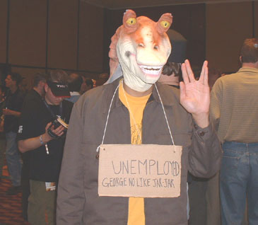 Jar Jar Binks. Der wohl meistgehasste Star Wars Charakter. Sicherlich auch ein Grund, warum viele von Episode I entäuscht waren. Es wurde dadurch einfach zu lustig, nicht würdig genug für einen Star Wars Film. Außerdem hat Jar Jar einfach nur gestresst :) Im deutschen übrigens noch mehr als in der englischen Version, vielleicht lag das aber auch daran, dass ich ihn nicht immer verstanden hab. Der Hass ging sogar so weit, das Fans eine geschnittene Version ohne Jar Jar gemacht habe. Es gibt eine Newsgroup a.f.s.jar-jar-bind.die.die.die, Hate-Pages und etwas extremer die National Association for the Extermination of the Gungan Race.