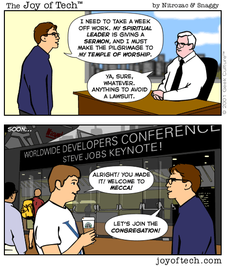 Dieses Keynotes, Rumors usw. Apple-Fan-Gehabe ist noch fast das Beste an einem Mac. Windows ist arschlahm dagegen. Kaum Neues (Centrino und Opteron vielleicht), überhaupt nichts Spektakuläres und vorallem absolut nix Kultiges. Da gefällt mir Apple besser. Mit der Beruhigung das ich nicht auf Apple angewiesen bin und auch mit Windows arbeite ist es einfach nur ein Spaß sich Steve Job anzugucken.