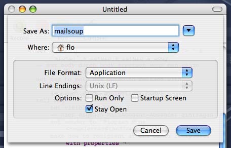 2. Das Script abspeichern. Ort und Name sind egal. Aber es muss als Programm abgespeichert sein und das Stay-Open-Flag muss gesetzt sein: