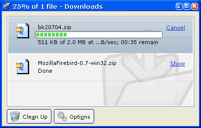 War es die letzte Zeit eher still um Mozilla Firebird, ist die letzten Tage ein spannendes neues Feature hinzugekommen, das de Download und Einsatz eines Nightlies doch rechtfertigt. Trotz des shameless rip-off von Safari ist der neue Download Manager sehr praktisch und eine von mir schon länger bemängelte Sache von Firebird. Diese vielen kleinen Fenster wenn man mehrere Downloads laufen hat und die man dann alle schließen muss wenn Sie fertig sind (und die dann unter XP nervig in der Taskbar bouncen flashen)